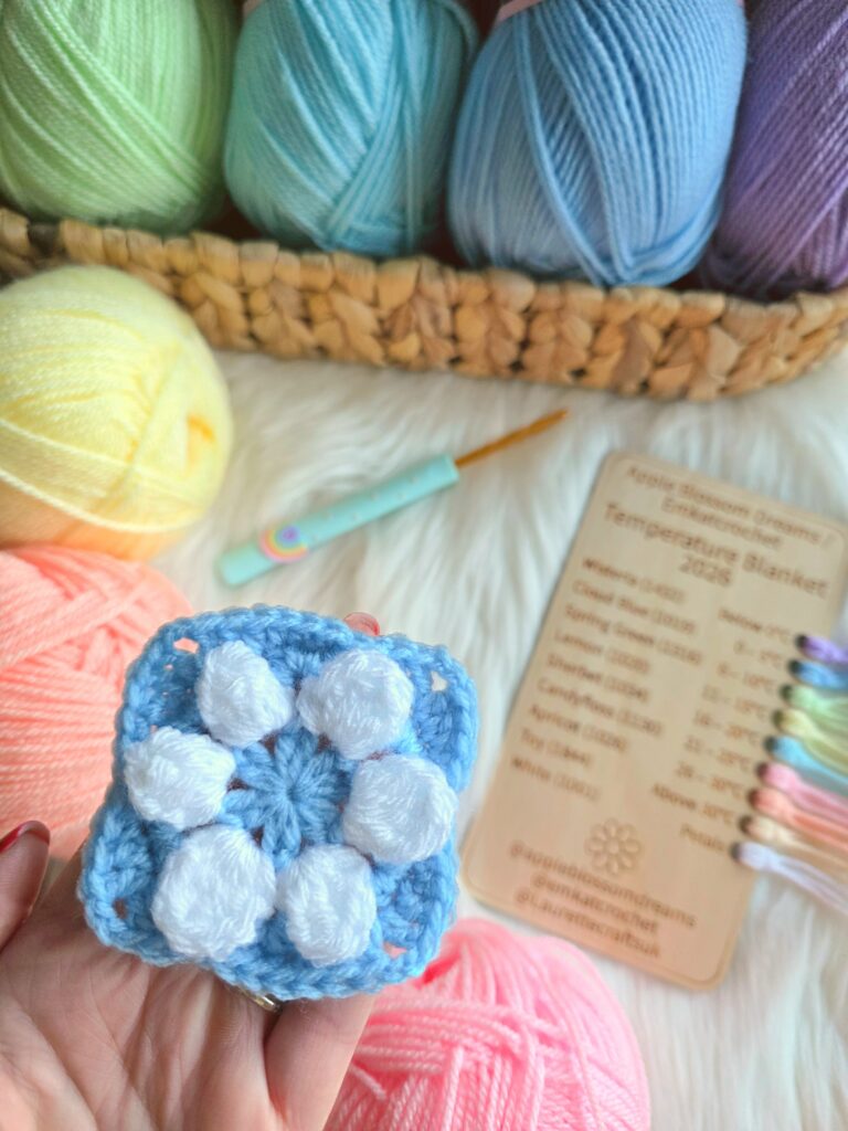 I am completely in love with my A Year in Flowers temperature blanket already. I’m fully up to date with my flower motifs and it’s been so exciting to see how the changing temperatures are starting to creep into the colours.