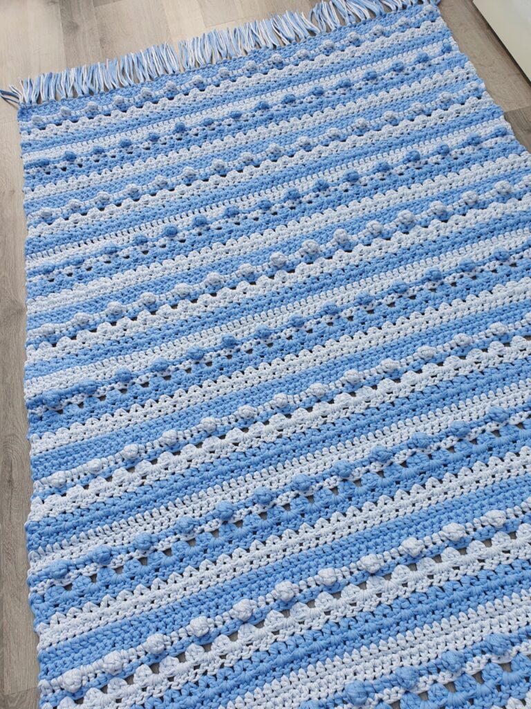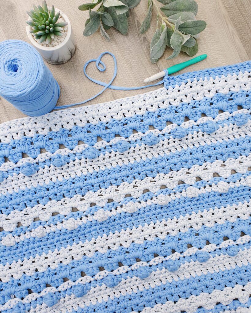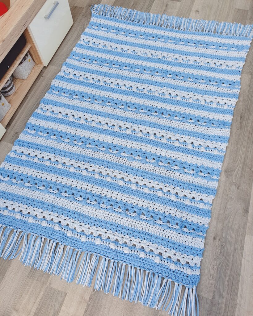 Made with chunky t-shirt yarn, this rug works up quickly and creates a sturdy, textured piece perfect for adding handmade charm to your home. The striped design allows you to play with colours and create a unique statement rug for any room. A practical and satisfying project for crocheters who love home décor makes.